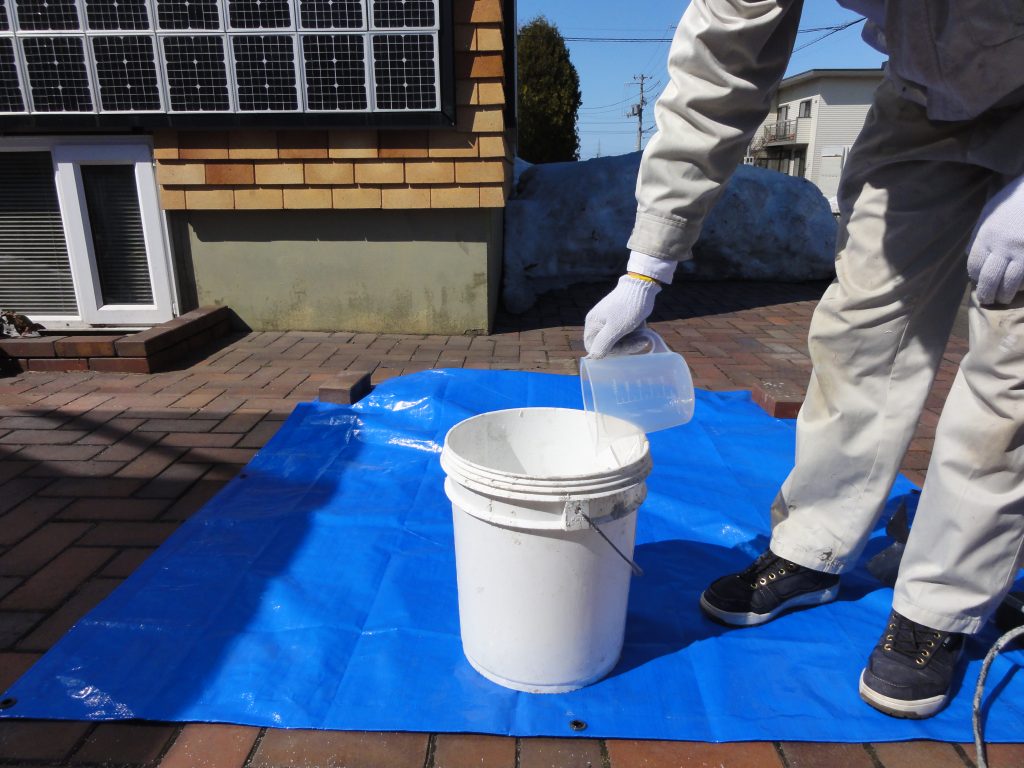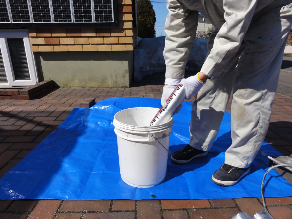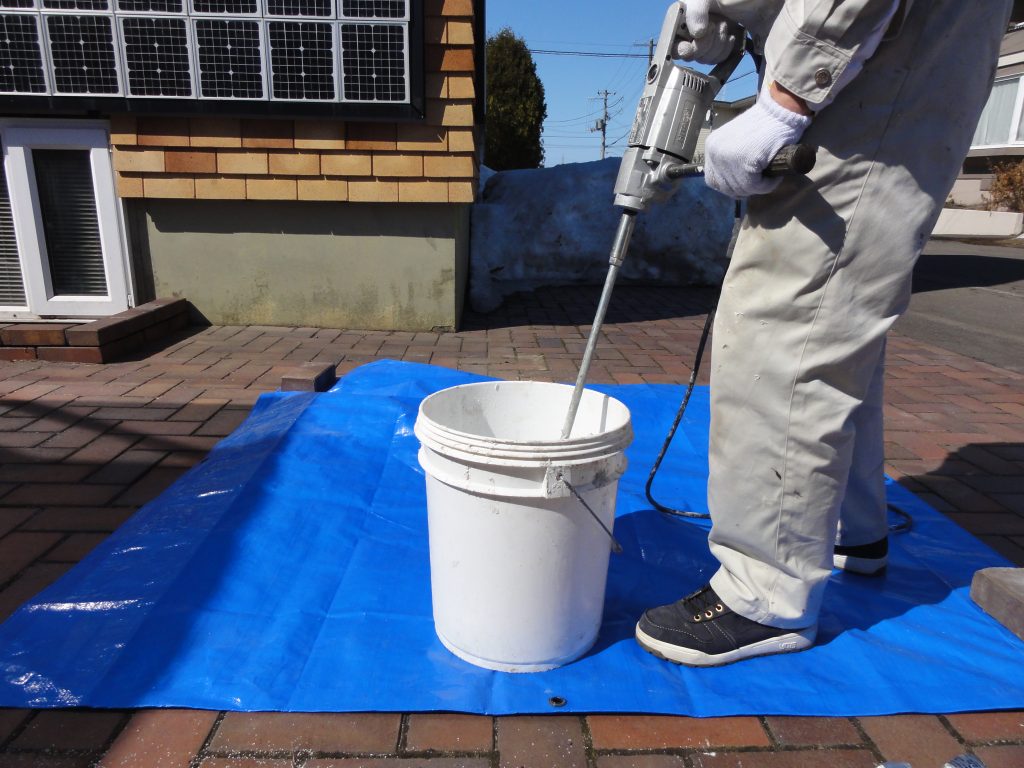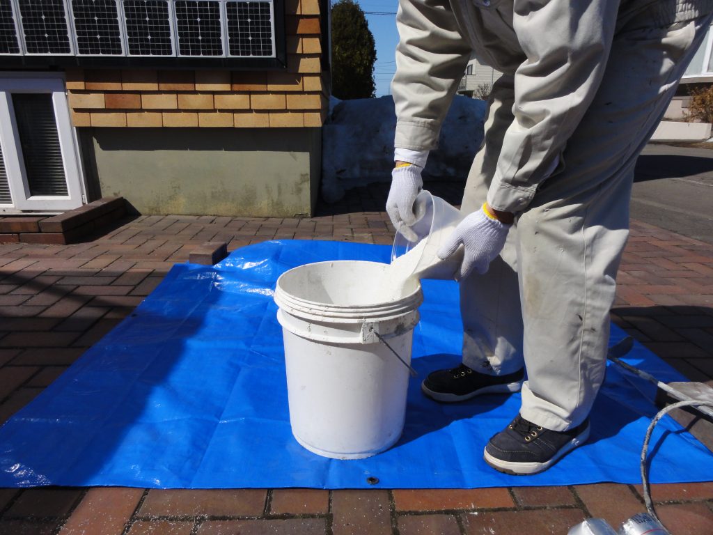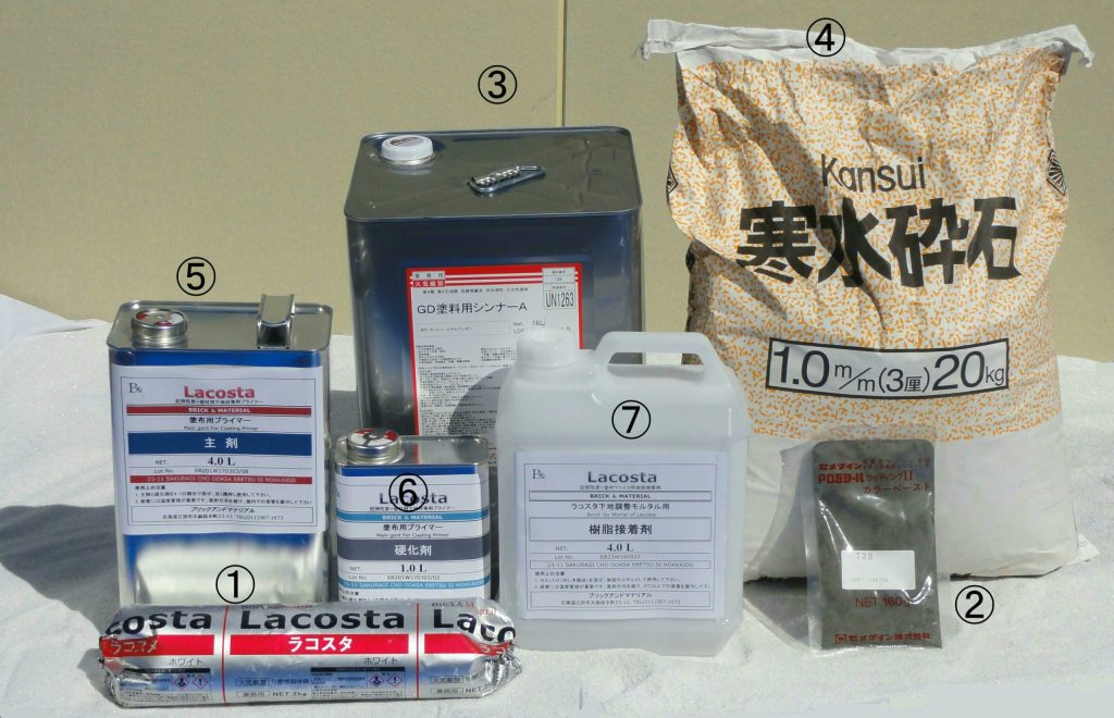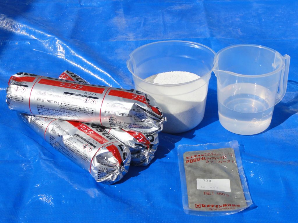 ラコスタの調合は主剤のラコスタと、副資材の減粘剤、カラートナー、寒水(白竜)砕石、以上の4種で構成しています。